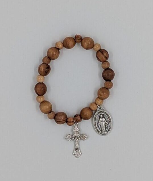 BRACELET EN BOIS D’OLIVIER DE BETHLÉEM AVEC MÉDAILLE ET CROIX.