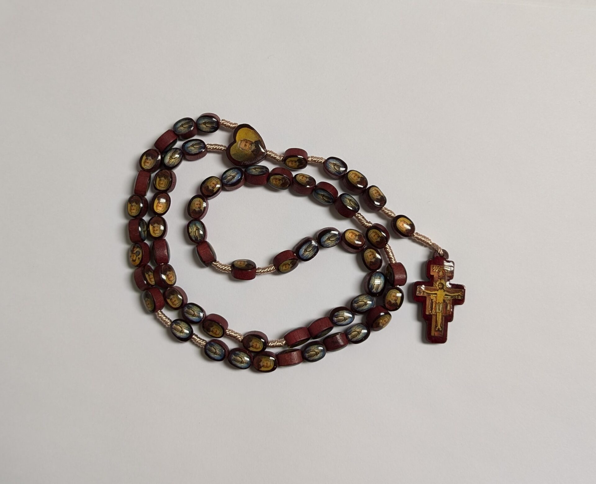 A BEAD IN THE CENTER IN THE SHAPE OF A HEART WITH THE IMAGE OF FATHER FREDERIC AND ON THE BACK THE IMAGE OF THE STATUE OF THE VIRGIN MARY WHO HAD OPENED HER EYES BEFORE FATHER FREDERIC IN 1888.